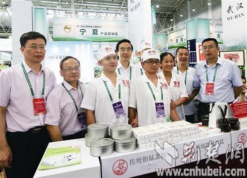 “犟媽”易勤(右三)率智障員工參加展能節(jié),現(xiàn)場展示武漢市東方紅食品有限公司的產(chǎn)品。